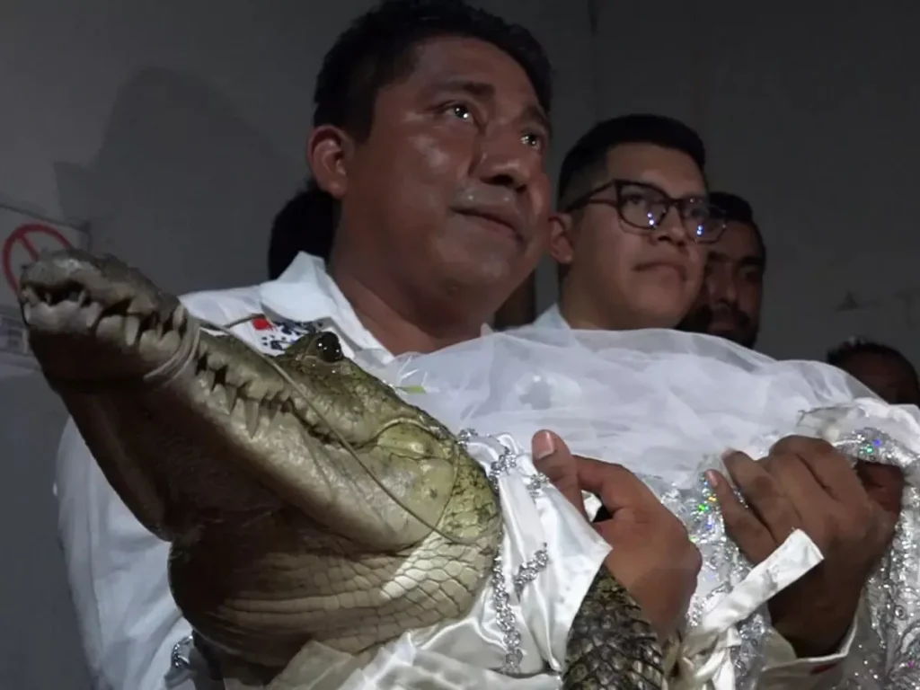 Etkinlikte, Gutierrez Chontal Kralı’nı temsil ederken, timsah Huave halkının kutsal “prenses çocuk” figürü olarak yer aldı. Nikah, yerel bir kabile lideri tarafından kıyıldı.